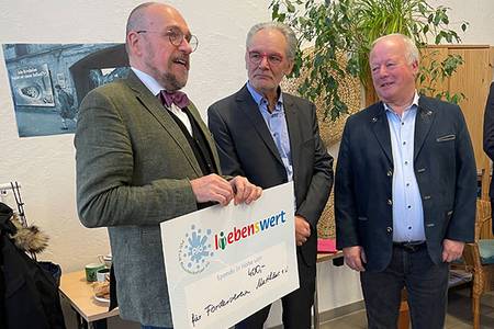 Dr. Carsten T. Rees nimmt den Scheck von Vertretern der PSD Bank entgegen.