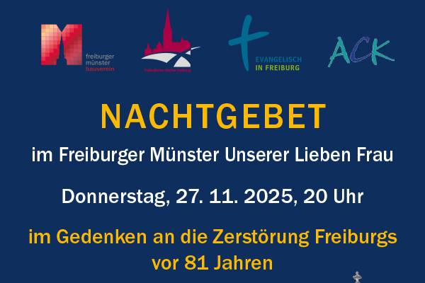 Zum 80. Jahrestag der Zerstörung Freiburgs in der Bombennacht am 27.11.1944 laden der Münsterbauverein, das Evangelische und Katholische Stadtdekanat sowie die ACK (Arbeitsgemeinschaft Christlicher Kirchen und Gemeinden) zum Nachtgebet ins Münster Unserer Lieben Frau am Donnerstag, 27. November um 20 Uhr ein. Die musikalische Gestaltung übernimmt der Männerchor der Freiburger Dommusik.